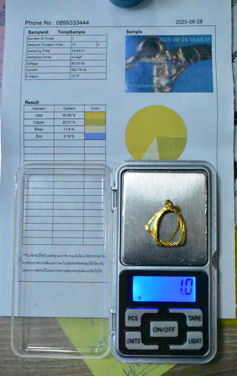 เคาะเดียว กรอบทอง 65.69 เปอร์เซนต์ จอในกว้าง 1.3 สูง 1.9 เซนติเมตร หนัก 1 กรัมถ้วน ผมแกะออกจากพระปิดตา