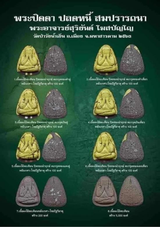พระปิดตาปลดหนี้ สมปราณถนา หลวงพ่อสุริยันต์ วัดป่าวังน้ำเย็น เนื้อผงไม้ตะเคียน ปี2563 สร้าง 5000 องค์ |