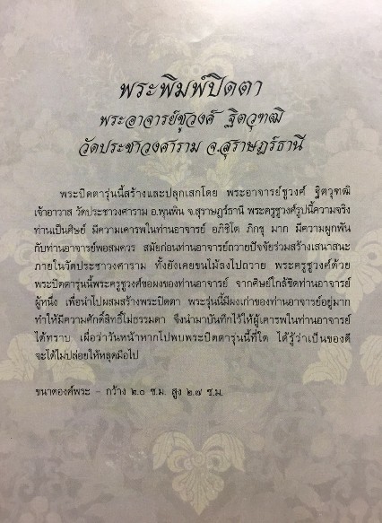 พระปิดตาพระอาจารย์ชูวงศ์ วัดประชาวงศาราม สุราษฎร์ธานี ปี 2536 พระรุ่นนี้มีส่วนผสมผงของหลวงพ่อชาญณรงค์ พระอาจารย์ชูวงศ์ ถือว่าเป็นลูกศิษย์หลวงพ่อชาญณรงค์ อภิชิโต ราคาไม่แรงกว่ารุ่นอื่น และที่สำคัญมวลสารหลวงพ่อชาญณรงค์เยอะมากๆห้อยบูชาแทนรุ่นแรกได้เลยค่ะ และที่สำคัญพระอาจารย์ชูวงศ์ ร่างท่านไม่เเน่าไม่เปื่อนค่ะ บุญอภิหารมากมาย น่าบูชามากค่ะ