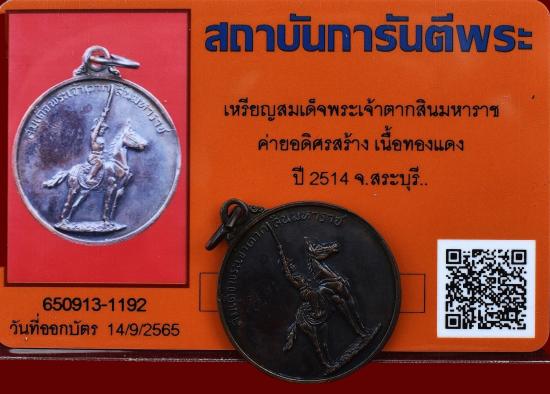 เหรียญสมเด็จพระเจ้าตากสินมหาราช ค่ายอดิศรสร้าง เนื้อทองแดง ปี 2514 จ.สระบุรี พระดี พิธีใหญ่ + บัตรรับรองพระแท้การันตีพระ สภาพพระตามรูปที่ลงทุกประการ