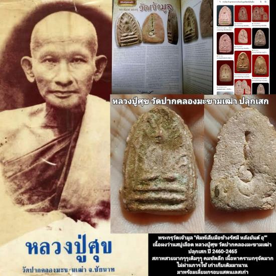 หลวงปู่ศุขร่วมปลุกเสก ด้านหลังยันต์มะอะอุ สมัยก่อนจะพบเห็นพระกรุชุดนี้บ่อยๆ แต่ปัจจุบันลูกศิษย์ลูกหาต่างซุ่มเก็บเงียบกันหมด อายุพระร่วมร้อยปี หลวงปู่ศุขปลุกเสก หลังจากเปิดกรุ ได้นิมนต์ลป.โต๊ะ วัดประดูฉิมพลีมาปลุกเสกพระอีกรอบ ทั้งยังนำพระเข้าพิธีใหญ่ให้ท่านเจ้าคุณนรฯอธอษฐานจิตอีกด้วย
