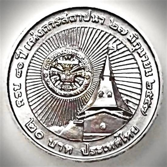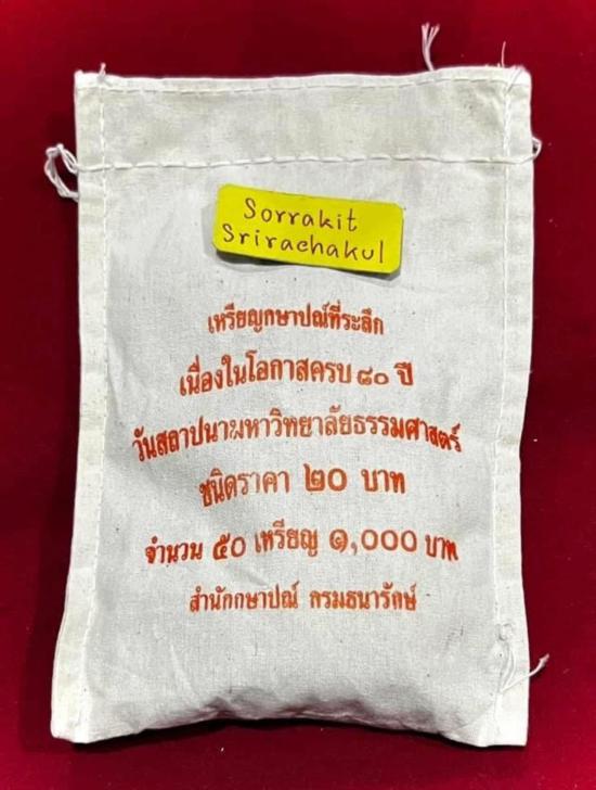 เหรียญ 20 บาท ที่ระลึก เนื่องในโอกาสครบ 80 ปีวันสถาปนามหาวิทยาลัยธรรมศาสตร์ ยกถุง 50 เหรียญอยู่ในถุงผ้าเดิมๆจากกรมธนารักษ์ยังไม่เคยเปิดปากถุงสวยงามหายากน่าสะสม |