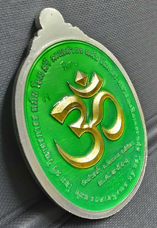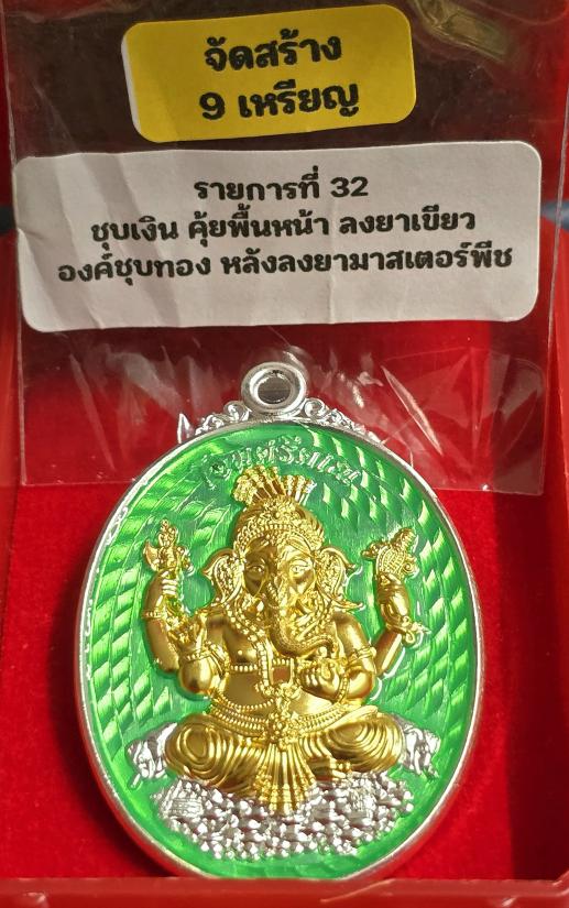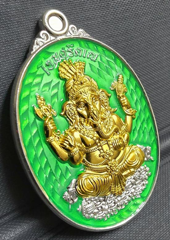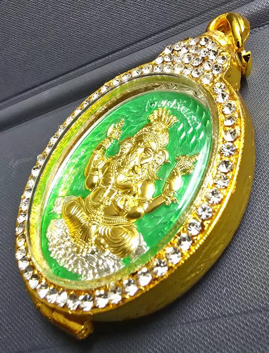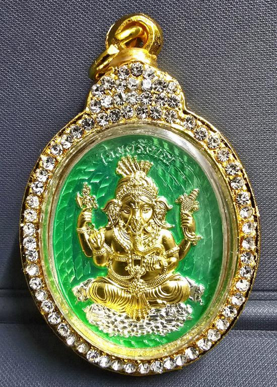 สร้าง 9 องค์ หมายเลข ๕๕๕..พระพิฆเนศ "โอมศรีคเณ" วัดท้ายน้ำ จ.พิจิตร เนื้อชุบเงิน คุ้ยพื้นหน้า ลงยาเขียวหน้า-หลังมาสเตอร์พีช องค์ชุบทองหน้า-หลัง เลี่ยมกรอบชุบทองฝังเพชร |
