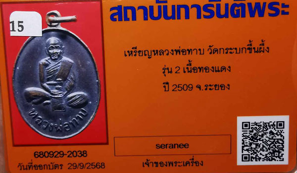 เหรียญพ่อทาบ วัดกระบกขึ้นผึ้ง รุ่น2 เนื้อทองแดง ห่วงเดิม ปี2509 จ.ระยอง + บัตรG-pra สภาพเดิมค่ะ |