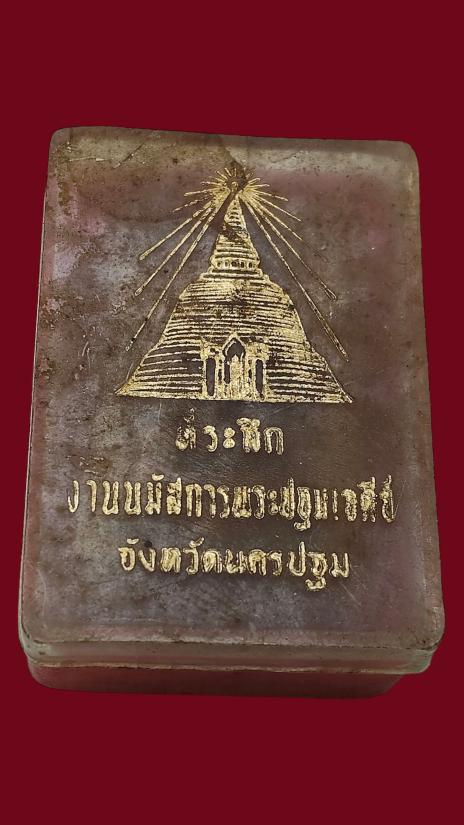 สมเด็จหน้ากล่องเขียนว่า นมัสการพระปฐมเจดีย์ จังหวัดนครปฐม |