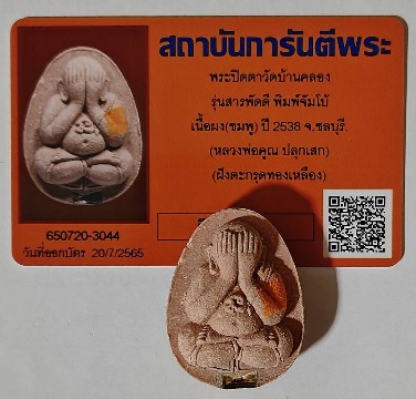 พระปิดตาสารพัดดี 3 ไตรมาส หลวงพ่อคูณ ปริสุทโธ ออกวัดบ้านคลอง ปี 2538 เนื้อผง(ชมพู) ฝังตะกรุดทองเหลือง ติดจีวร |