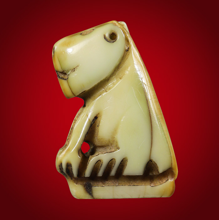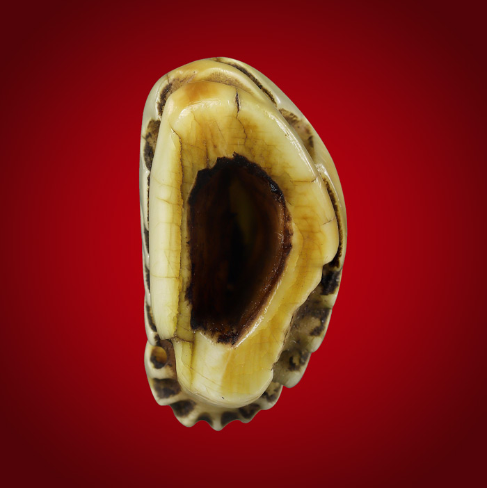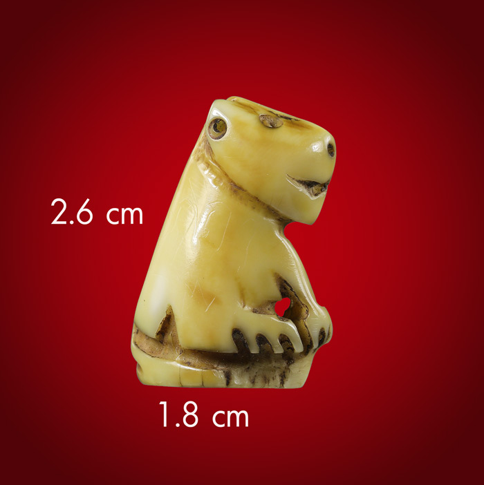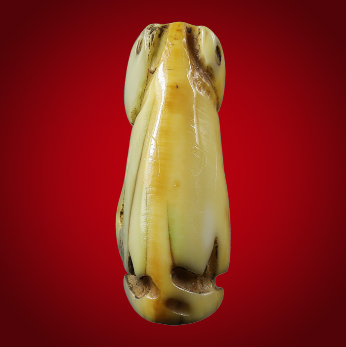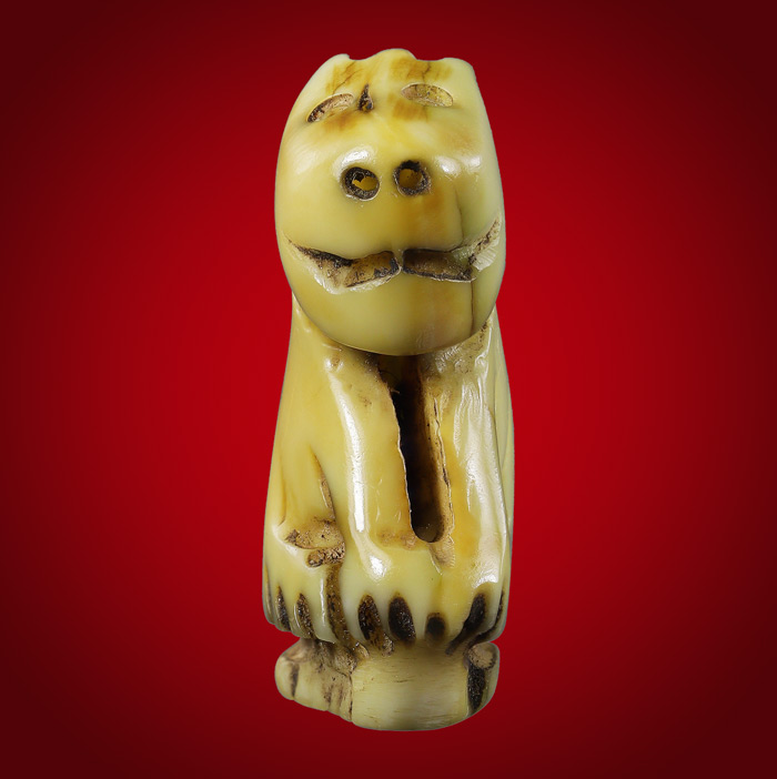 เสือ แกะจากเขี้ยว พิมพ์ปากหุบ(ไม่ทราบที่สร้าง) ขนาดเสือฐาน 1.8cm สูง 2.6 cm |
