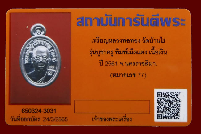 แดงที่เคาะแรก !!! เหรียญเม็ดแตง เนื้อเงิน รุ่นบูชาครู หลวงพ่อทอง วัดบ้านไร่ ปี2561 (หมายเลขสวย 77)+ บัตรพระแท้