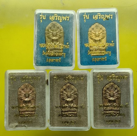 จัดชุดห้าองค์ พระปรก เนื้อทองฝาบาตร+ทองแดง รุ่นเจริญพร หลวงปู่จันทร์หอม สุภาทโร วัดบุ่งขี้เหล็ก จ.อุบลราชธานี สวย พร้อมกล่องเดิม วัดใจ |