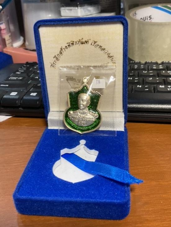 กรมหลวงชุมพรฯ รุ่นที่ระลึกสร้างพิพิธภัณฑ์เรือหลวงลันตา เหรียญเนื้อเงินลงยาสีเขียว หมายเลข 13 มาพร้อมกลองเดิมๆครับ