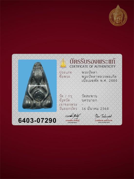 พระปิดตาหลวงพ่อเกิด เนื้อเมฆพัด ปี2484 วัดสะพาน จังหวัดนครนายก พร้อมบัตรรับรอง