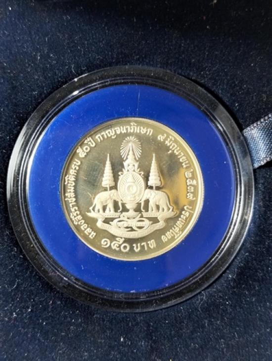เหรียญในหลวง ร.9 กาญจนาภิเษก 150 บาท เนื้อเงินขัดเงา 1 เหรียญพร้อมกล่อง (ฝากล่องด้านบนมีชำรุด)