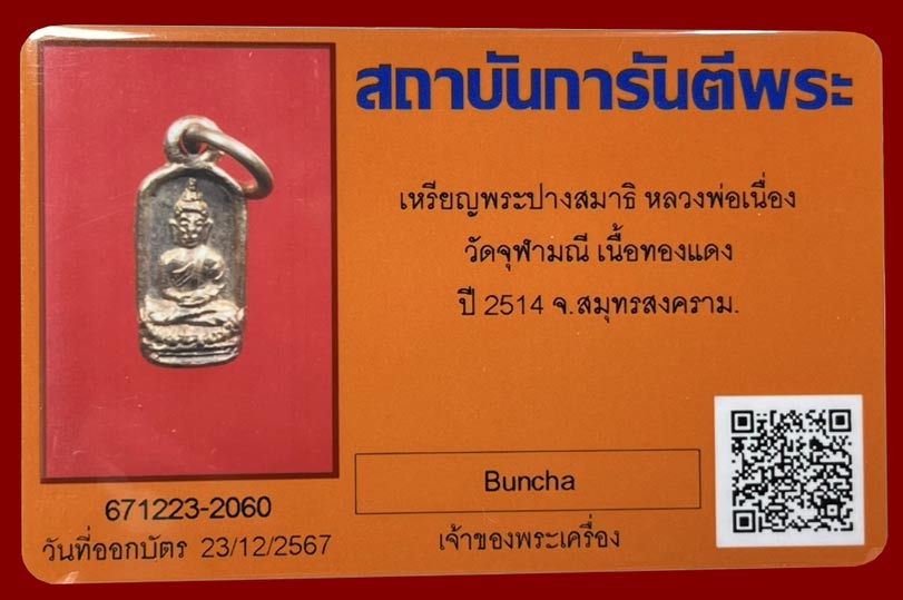 !!!...วัดใจ...เหรียญพระประจำวัน พิมพ์พระปางสมาธิ(วันพฤหัสบดี) ปี2514 หลวงพ่อเนื่อง วัดจุฬามณีฯจ.สมุทรสงคราม เนื้อทองแดงผิวไฟ หายาก สภาพสวย พร้อมบัตรรับรองครับ...!!! |