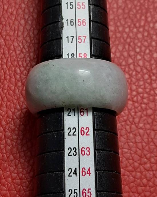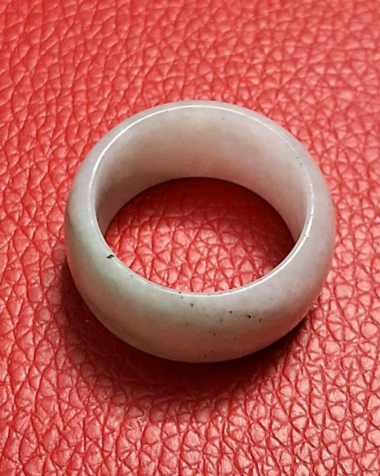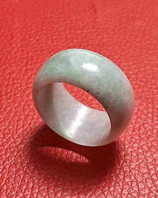 แหวนหยกท้องปลิง หยกพม่าแท้ 100 % (แสงส่องผ่าน) สีเขียวอ่อน ลายธรรมชาติ สวยมากๆ เส้นผ่าศูนย์กลาง 1.8 ซม. หนา 1.1-1.2 ซม. หายาก (กท.45)