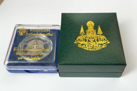 พระกริ่งหลวงพ่อโสธร ภปร. ในหลวงทรงครองราชย์ 50 ปี พ.ศ.2540 และเหรียญหลวงพ่อโสธร เนื้อเงิน หลังโฮโลแกรม 3 มิติ รุ่น สร้างอุโบสถหลังใหม่ พ.ศ.2542 พร้อมกล่องเดิมจากวัด |