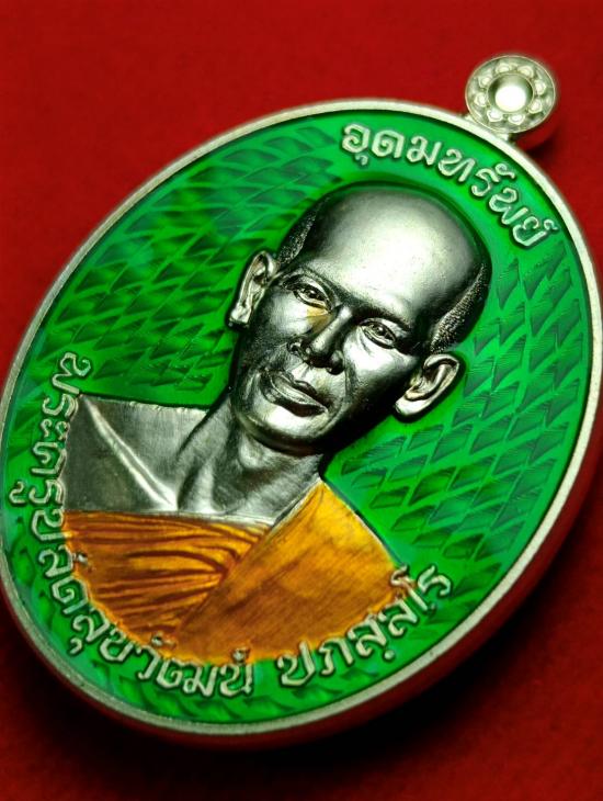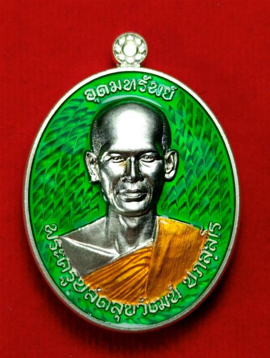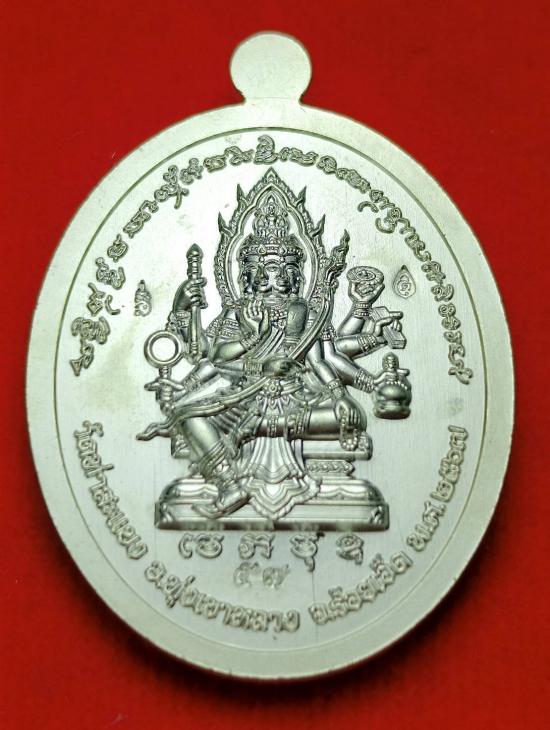 เหรียญรูปไข่อุดมทรัพย์ หลังพระพรหม พระอาจารย์ต้อม ปภัสสโร วัดท่าสะแบง จ.ร้อยเอ็ด ปี 2567 (เนื้อชุบเงิน ลงยาเขียว ลงยาจีวร (มวลสาร 200 ล้าน) ตอกโต๊ต 3 โค๊ต หมายเลข ๕๗ พร้อมกล่องสร้าง 590 เหรียญ |