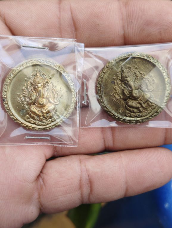 ลักษณะเหรียญทรงกลม ด้านหน้าจะเป็นพระพิฆเนศร์ ปางประทานพร ด้านหลัง ยันต์ โอม ศรี คเณศายะ นะมะฮา เป็นบทสวดบูชาขอพรขอความสำเร็จในด้านต่างๆ มีโชค และมีทรัพย์เงินทอง สมความสำเร็จทุกปรารถนา |