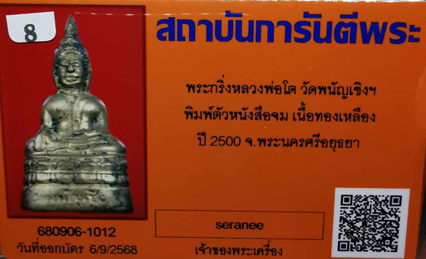 พระกริ่งหลวงพ่อโต วัดพนัญเชิง จ.อยุธยา ปี2500 หนังสือจม(นิยม) กริ่งดัง + บัตรG-pra สภาพเดิมค่ะ |