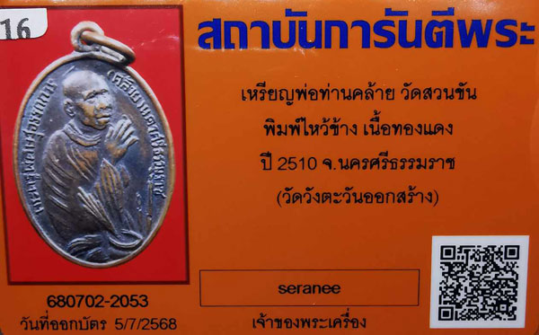 เหรียญพ่อท่านคล้าย วัดสวนขัน พิมพ์ไหว้ข้าง(หัวขีด) เนื้อทองแดง ห่วงเดิม ปี2510 จ.นครศรีธรรมราช(วัดวังตะวันออกสร้าง) + บัตรG-pra สภาพเดิมค่ะ สภาพตามรูปทุกประการค่ะ