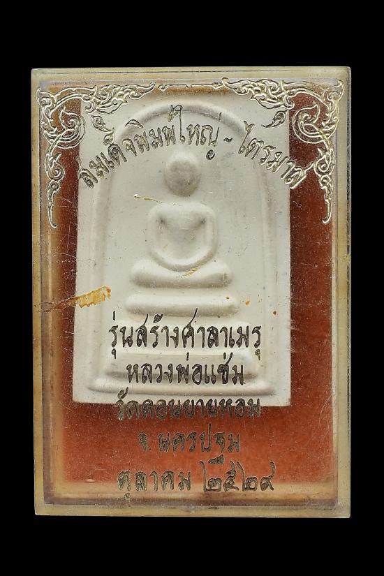 *** วัดใจ 150 บาท แดง *** พระสมเด็จ พิมพ์ใหญ่ - ไตรมาส รุ่นสร้างศาลาเมรุ เนื้อผงพุทธคุณ ปี 2529 หลวงพ่อแช่ม วัดดอนยายหอม จ.นครปฐม มีกล่อง สภาพพระตามรูปที่ลงทุกประการ (ขนาดประมาณ 3.5 x 2.4 ซม.)