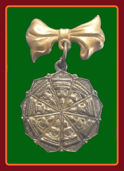 กะไหล่เงิน สวย-250*เหรียญดอกไม้ 9พระพุทธ หลังสมเด็จโตฯ วัดเทพากร ปี2514 หลวงพ่อกวย,ลป.โต๊ะ ปลุกเสก |
