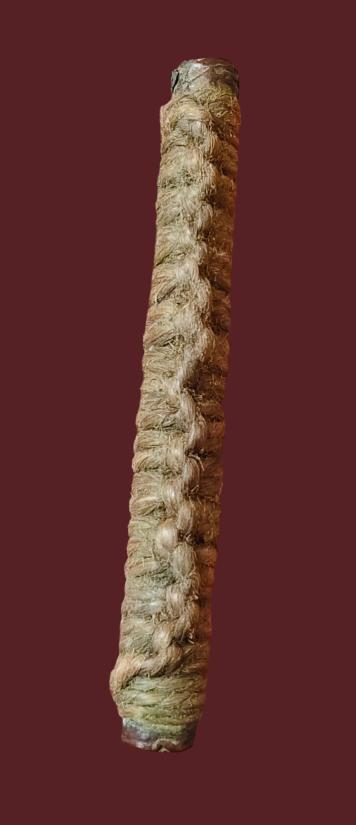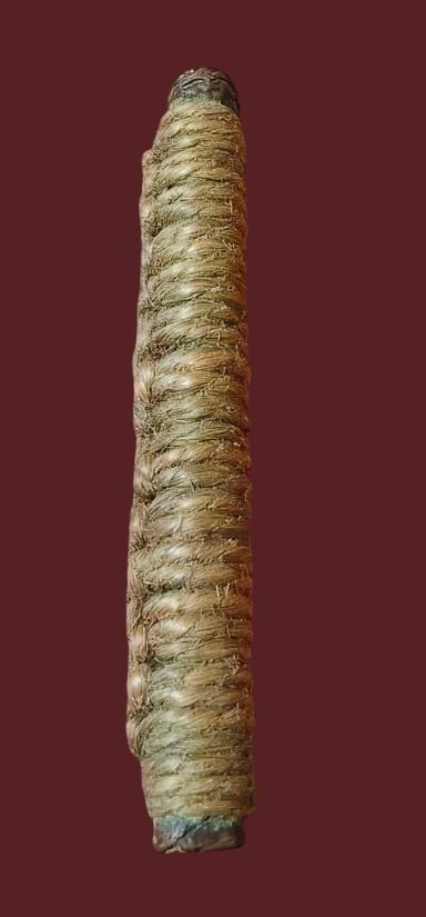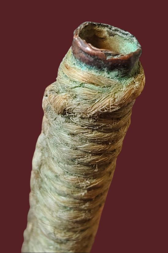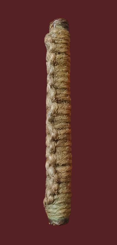 ตะกรุดเนื้อทองแดงถักเชือกปอ มีอายุเก่ายาว 3 นิ้ว |
