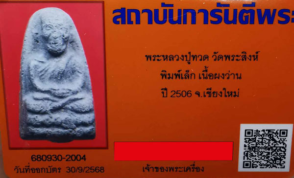พระหลวงปู่ทวด วัดพระสิงห์ พิมพ์เล็ก เนื้อผงว่าน ปี2506 จ.เชียงใหม่ + บัตรG-pra สภาพเดิมค่ะ |