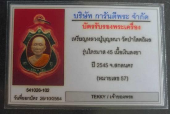 เหรียญครบ6รอบ ไตรมาส45 หลวงปู่บุญหนา วัดป่าโสตถิผล เนื้อเงินลงยาเขียว NO.57 มีรอยจาร สภาพสวยมาก พร้อมบัตรรับรอง |