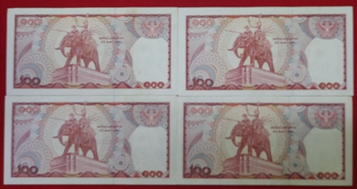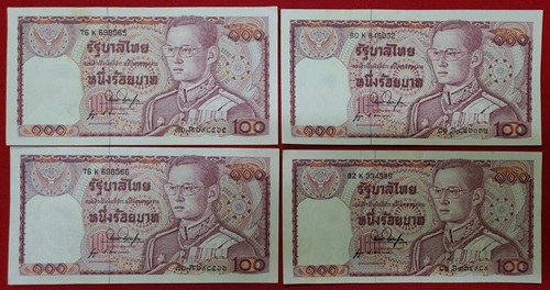 ธนบัตร 100 บาท ในหลวงรัชกาลที่ 9 แบบ 12 ด้านหลังช้างแดง จำนวน 4 ฉบับ สภาพ UNC สวย,ใหม่,ไม่ได้ใช้,ไม่มีรอยพับ ลายเซ็น สมหมาย ฮุนตระกูล - นุกูล ประจวบเหมาะ เลข 6หลัก |