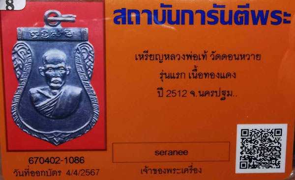 เหรียญหลวงพ่อเท้ วัดดอนหวาย รุ่นแรก เนื้อทองแดง ห่วงเดิม ปี2512 จ.นครปฐม + บัตรG-pra สภาพสวยเดิมค่ะ สภาพตามรูปทุกประการค่ะ