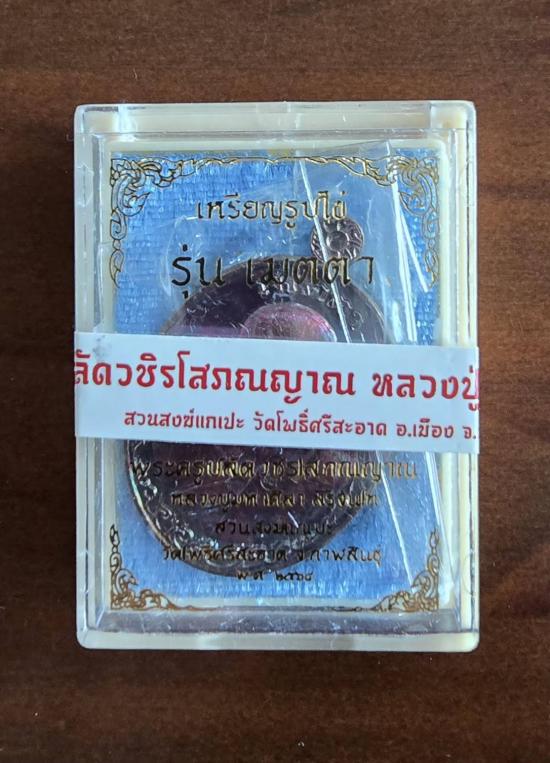 เหรียญเมตตา หลวงปู่มหาศิลา วัดโพธิ์ศรีสะอาด จ.กาฬสินธุ์ เนื้อทองแดง ผิวรุ้งๆ เลข ๕๗๖๖ หลังหนุมาณหาง ๗ ขด แช่น้ำมันว่านโพรง ซีลเดิมพร้อมกล่องเดิม