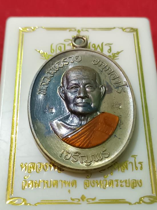 เหรียญเจริญพรล่างหลวงพ่อรวย วัดมาบตาพุด เนื้อชนวนลงยาจีวร No.54 |