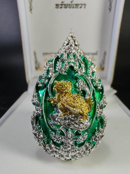 พุทธศิลป์ เหรียญท้าวเวสสุวรรณ รุ่น ทรัพย์เทวา วัดถ้ำเขาชะอางค์ จังหวัดกาญจนบุรี หน้าเทพพิมพ์ทรงจำปา หลังพญาเต่าเรือน(เต่ามังกร) รกที่.6 เนื้อบรอนซ์ชุบเงิน องค์ทองผิวแดงพื้นเขียว No.70 เลขสวย ราคาจอง 1099 บาท กล่องเดิม