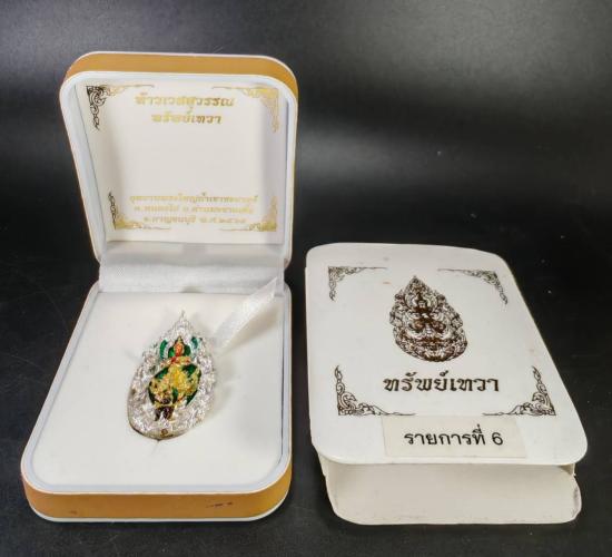 ( วัดใจ 109 บาท ) พุทธศิลป์ เหรียญท้าวเวสสุวรรณ รุ่น ทรัพย์เทวา วัดถ้ำเขาชะอางค์ จังหวัดกาญจนบุรี หน้าเทพพิมพ์ทรงจำปา หลังพญาเต่าเรือน(เต่ามังกร) รกที่.6 เนื้อบรอนซ์ชุบเงิน องค์ทองผิวแดงพื้นเขียว No.70 เลขสวย ราคาจอง 1099 บาท กล่องเดิม