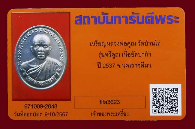 แดงที่เคาะแรก !!! เหรียญรุ่นทวีคูณ เนื้ออัลปาก้า หลวงพ่อคูณ วัดบ้านไร่ ปี2537 + บัตรพระแท้