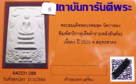 พระสมเด็จหลวงพ่อสุด วัดกาหลง พิมพ์สาริกาคู่เสือคำรามหลังยันต์อะ เนื้อผง ปี 2520 สมุทรสาคร มาพร้อมบัตรรับรอง <274> |
