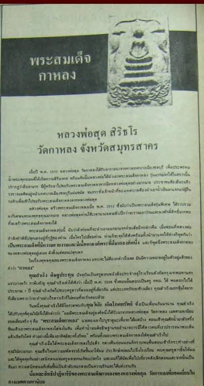 พระสมเด็จสาริกาคู่ ฐานหัวเสือ หลวงพ่อสุด วัดกาหลง จ. สมุทรสาคร ผู้ซึ่งอดีตจอมโจรชื่อดังอย่างตี๋ใหญ่ ให้ความศรัทธาในวิชาอาคมของท่านเป็นอย่างมาก จัดสร้างในปี พ.ศ. 2520 มีขนาดสูง 3.7 x 2.5 ซ.ม. มาพร้อมบัตรรับรองพระเครื่องเพื่อยืนยันความแท้ และไม่มีแต่งซ่อมใดๆ ซึ่งเป็นไปตามมาตรฐานของร้าน นิว พระเครื่องคือนอกจะแท้แล้ว ยังต้องสวยสมบูรณ์หมดจรดอีกด้วยครับ