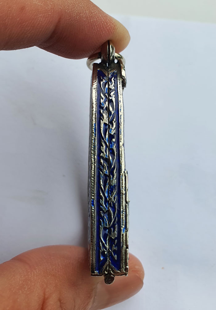 ตลับเงินยกซุ้มลงยา สภาพดีเหมือนใหม่ ใส่พระหลวงปู่ทวด พิมพ์เตารีดใหญ่ พระกริ่งใหญ่ และเกจิอื่นๆขนาดใกล้เคียง ขนาด 2.4x3.9 ซม. |