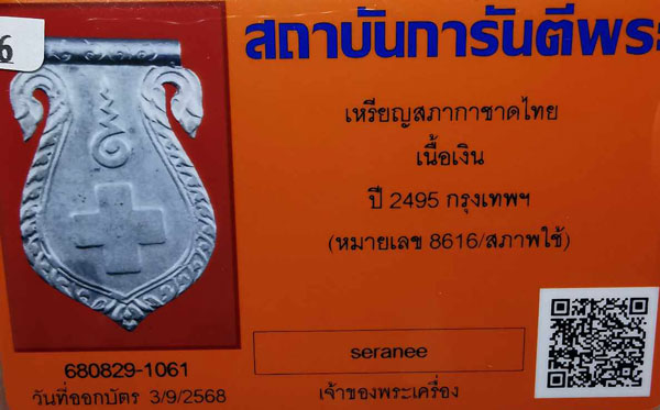 เหรียญสภากาชาดไทย เนื้อเงิน ปี2495 จ.กรุงเทพฯ(หมายเลข8616) + บัตรG-pra สภาพพระระบุตามบัตรรับรอง สภาพตามรุปทุกประการค่ะ