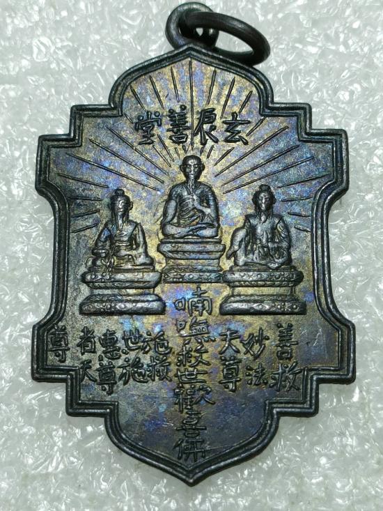 เหรียญสามเซียนมูลนิธิการกุศลสงเคราะห์ ปี 2497 ออกวัดญวน สะพานขาว กทม. เนื้อทองแดงรมดำ หลวงพ่อบ๋าวเอิง หลวงพ่อโอภาสี อธิษฐานจิต