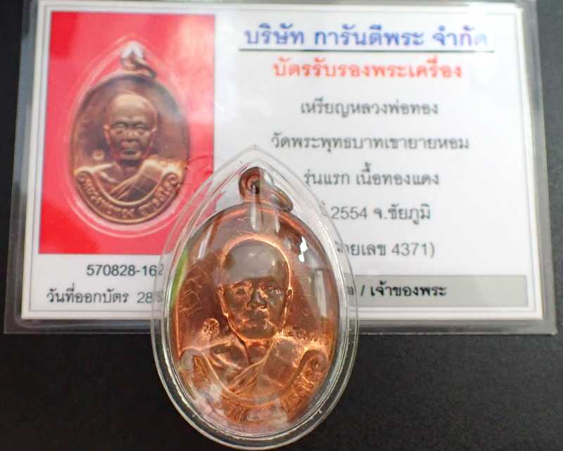เหรียญ"รุ่นแรก" หลวงพ่อทอง ปี2554 ทองแดงผิวไฟ บล๊อคทองคำ หมายเลข4371 ผิวสวยๆเดิมๆ เลี่ยมกันน้ำอย่างดี พร้อมบัตรการันตีครับ ไม่มีกล่องนะครับ