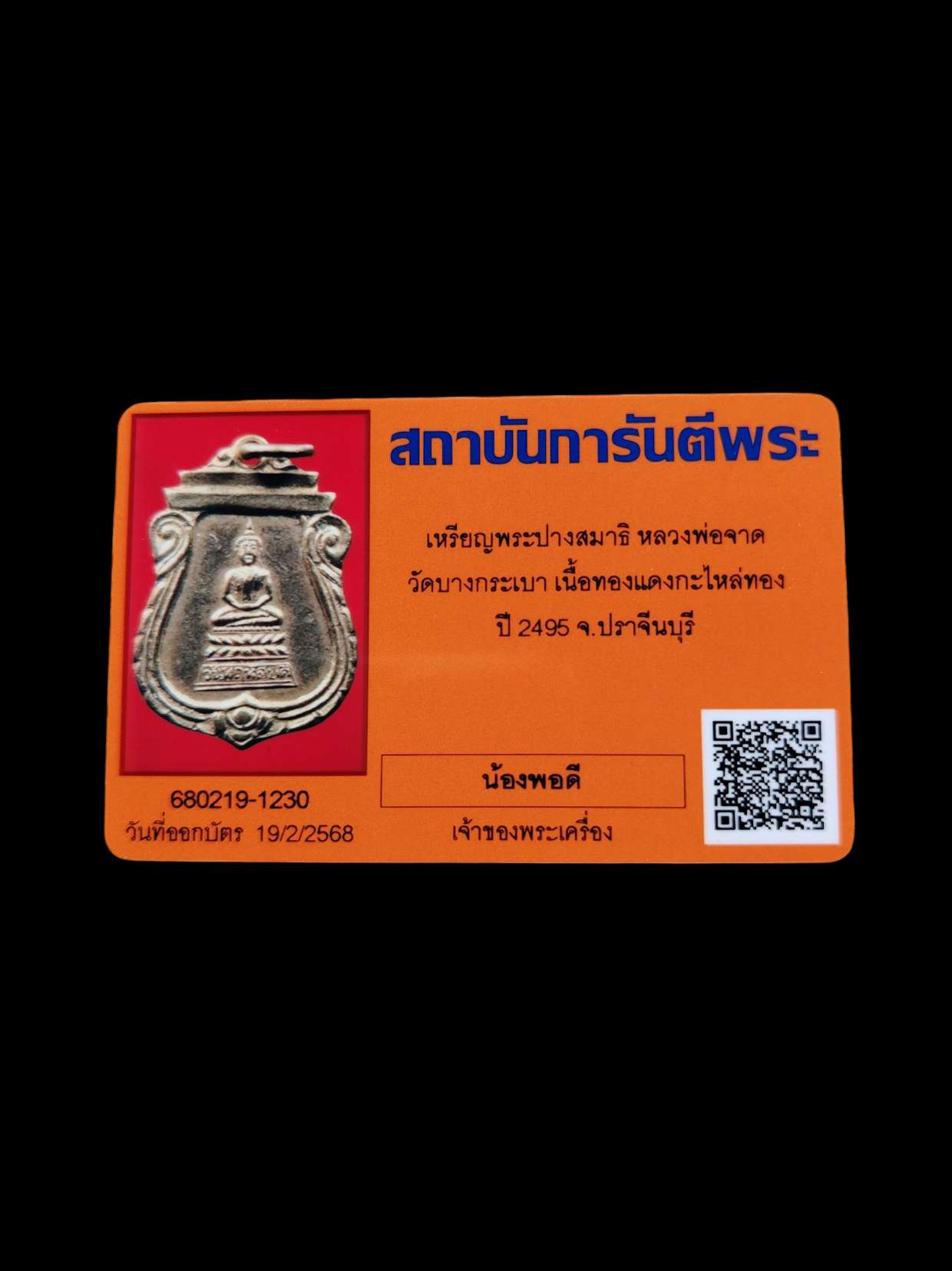 เหรียญพระปางสมาธิ หลวงพ่อจาดวัดบางกระเบา 2495 มาพร้อมบัตรรับรอง