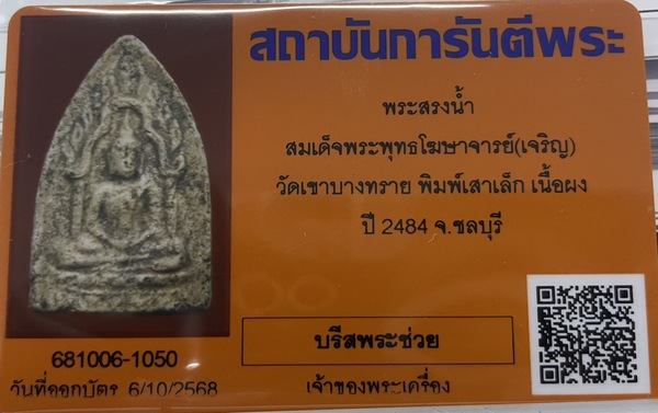 พระสมเด็จสรงน้ำ สมเด็จพระพุทธโฆษาจาร์ย(เจริญ) วัดเขาบางทราย พิมพ์เสาเล็ก เนื้อผง ปี 2484 จ.ชลบุรี พร้อมบัตร G-PRA
