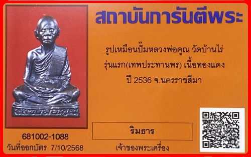 รูปเหมือนปั้มหลวงพ่อคูณ วัดบ้านไร่ รุ่นแรก(รุ่นเทพประทานพร)เนื้อทองแดง ปี2536 มีบัตรรับรองจีพระ เคาะเดียว |