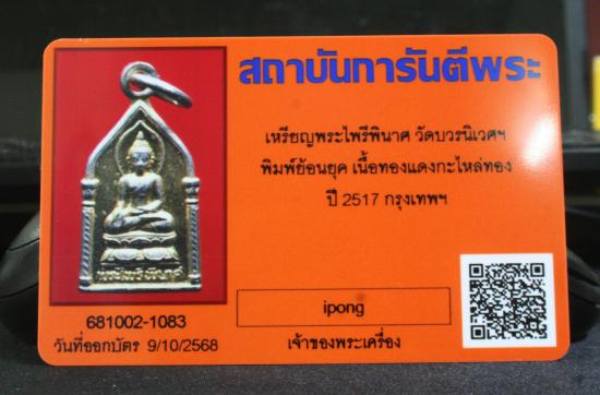 เหรียญพระไพรีพินาศ วัดบวรนิเวศ กรุงเทพ ปี 2517 หลวงปู่โต๊ะวัดประดู่ฉิมพลี เสก พร้อมบัตร |