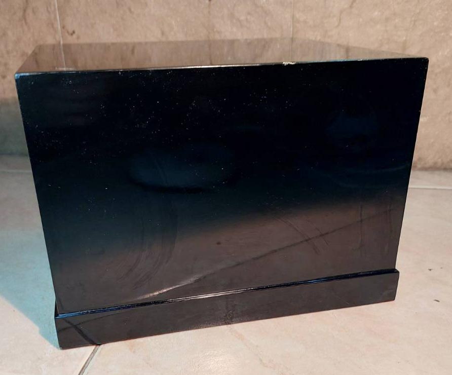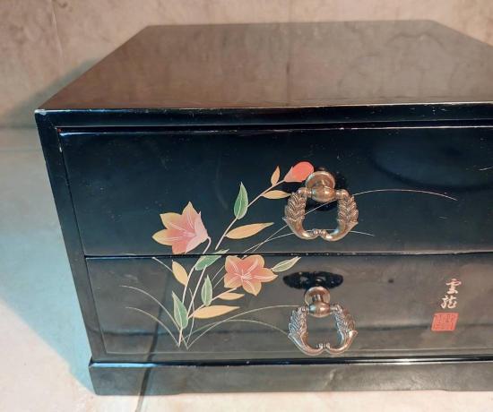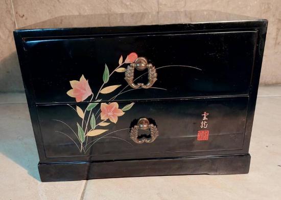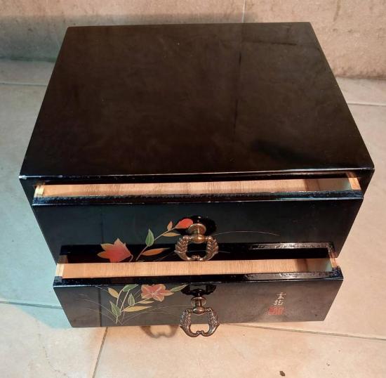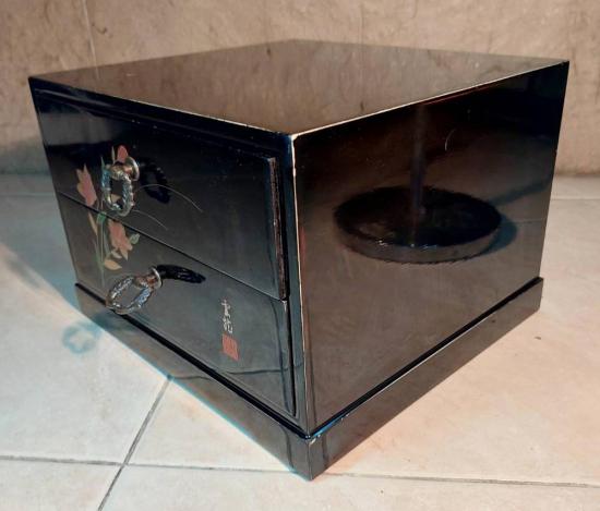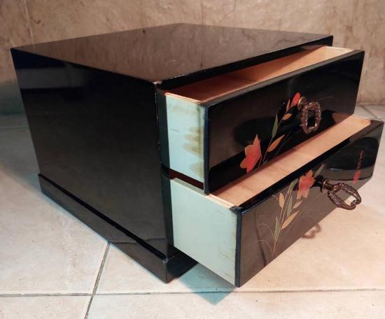 ***วัดใจ***กล่องไม้วินเทจญี่ปุ่น งานฝีมือเก่า 2 ลิ้นชัก สามารถวางพระบูชา 5 นิ้วได้ สีดำลายดอกไม้ |