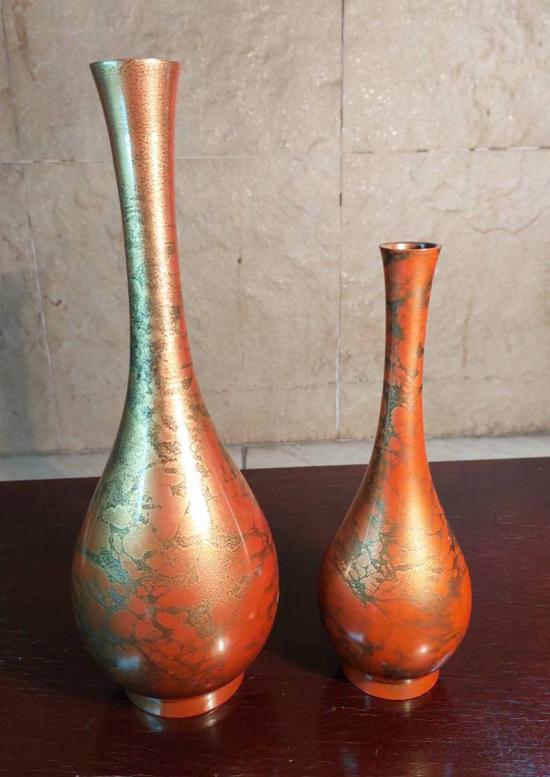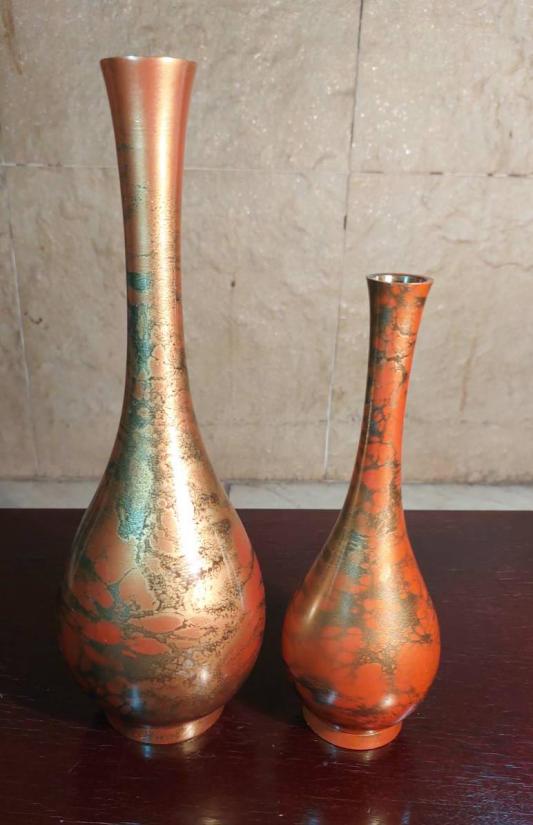 แจกันเก่าเก็บเนื้อทองเหลืองลงยา (มูราชิโด)งานของญี่ปุ่น สีส้ม ลายทอง 2 ขนาด สูง 10 นิ้ว กับ 7.5 นิ้ว |
