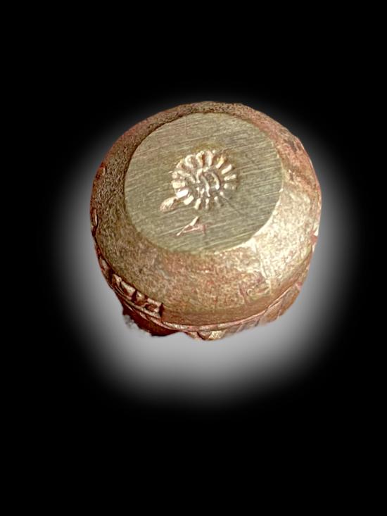 เนื้อโลหะรมแดงอมทองเข้ม มีโค้ดยันต์ใต้ฐานครบถ้วน