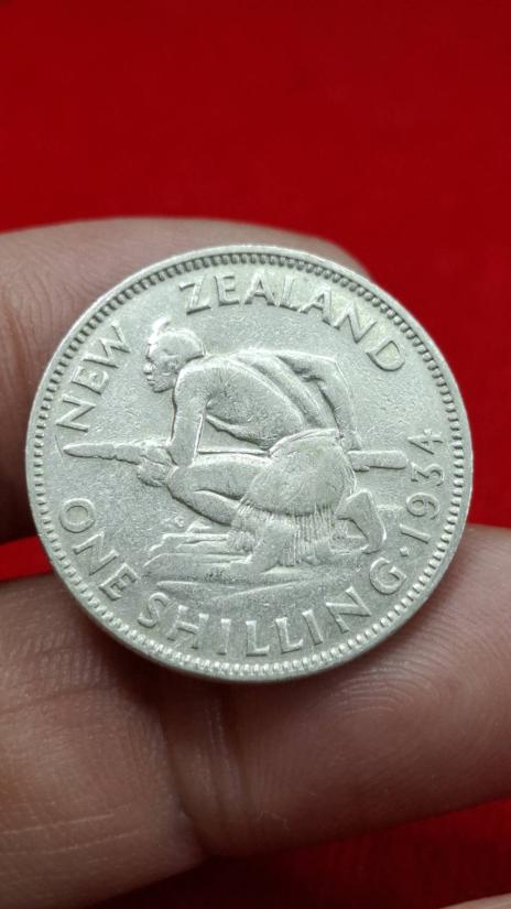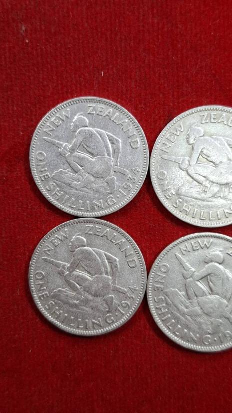 เหรียญ 1 ชิลลิงของนิวซีแลนด์ที่ผลิตในปี ค.ศ. 1934 ด้านหน้า: เป็นพระบรมสาทิสลักษณ์ของพระเจ้าจอร์จที่ 5 แห่งสหราชอาณาจักร เนื้อเงิน 56% ทั้งหมด 4เหรียญ |