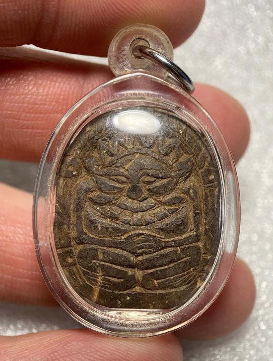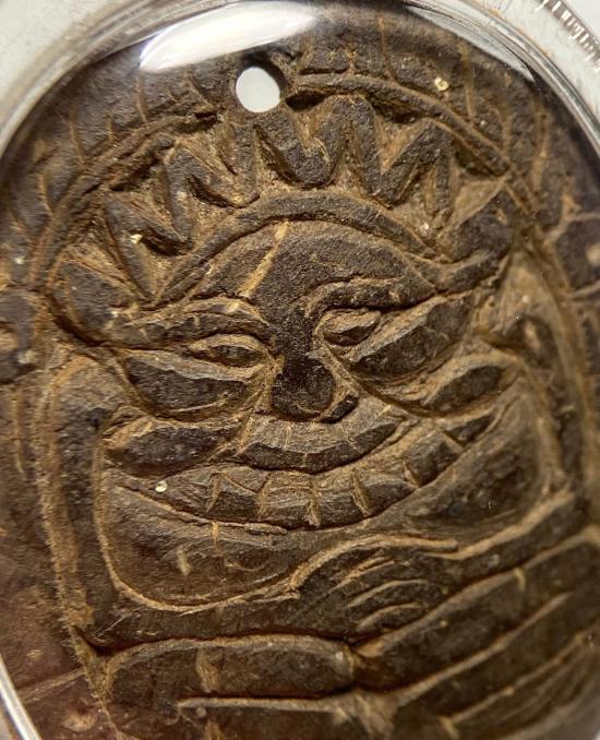 กะลาแกะพระราหู ศิลปะนั่งยอง แกะแบบลึก คม ชัดเจน ตัวกะลาเก่าแห้ง ด้านหลังไม่มีจารครับ ขนาดกว้าง ๒.๕ ซม. สูง ๓ ซม.ครับ ด้านบนมีรอยเจาะรู สมัยก่อนจะเจาะรูเอาเชือกร้อยห้อยติดตัว หรือ ห้อยติดบ้านแทนการเลี่ยมครับ